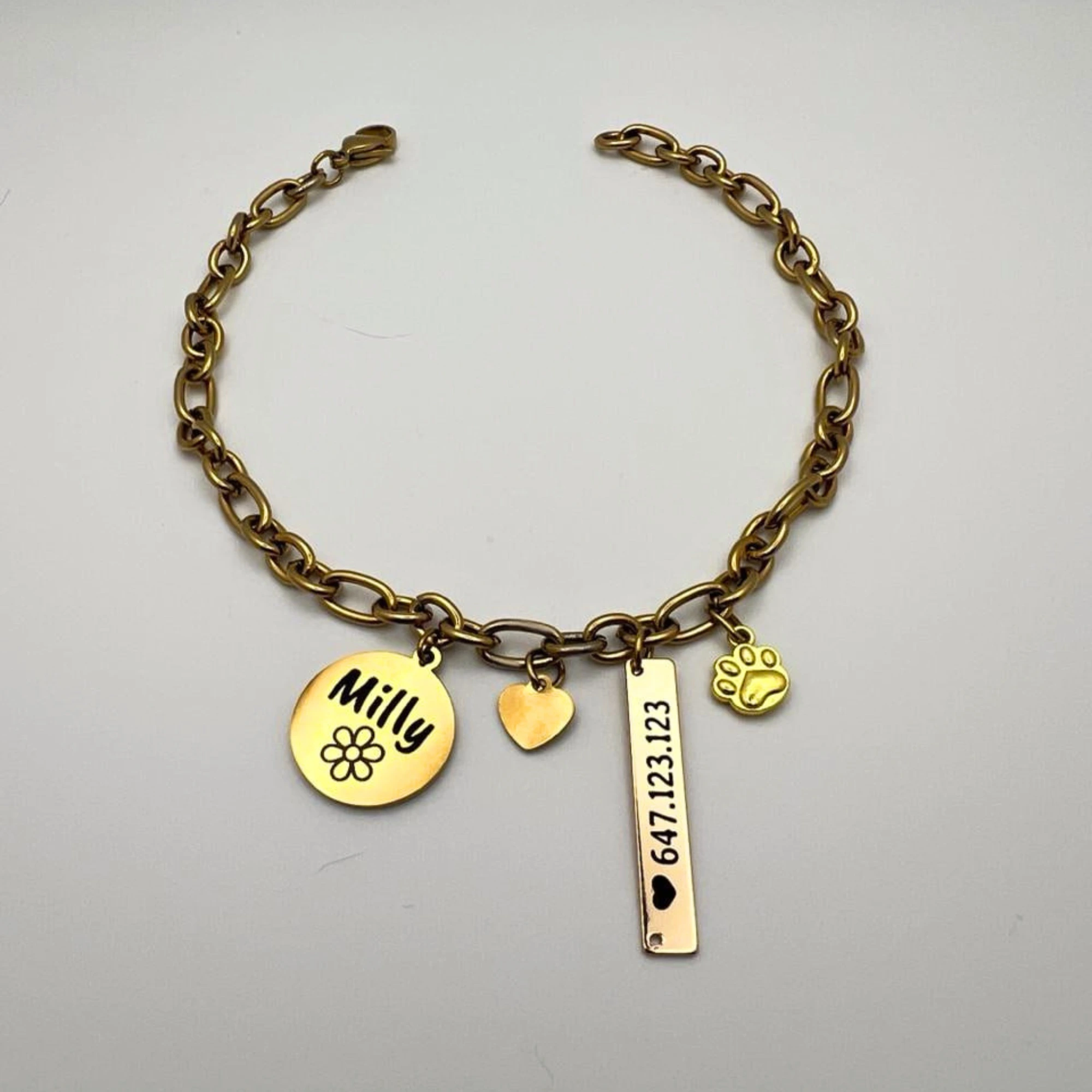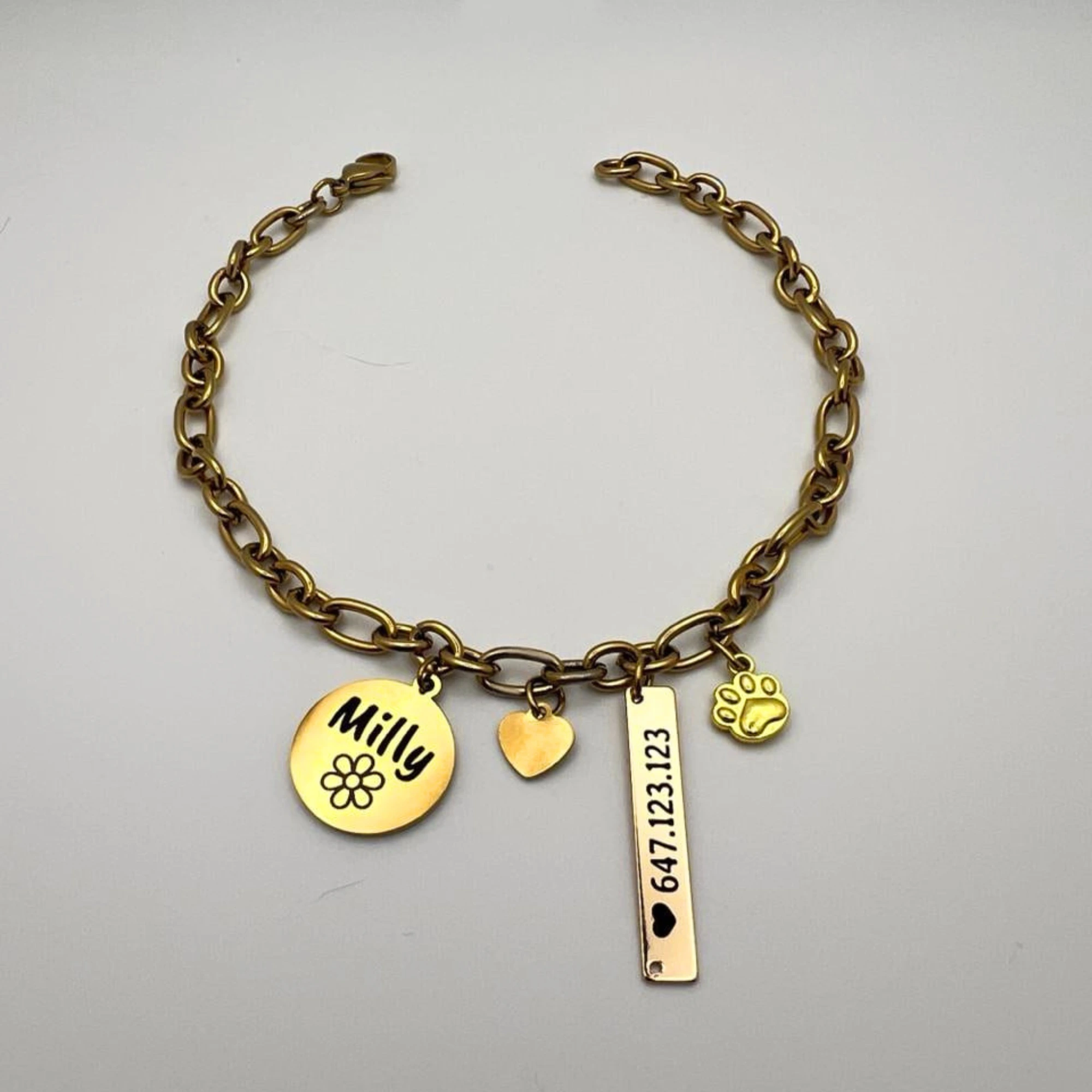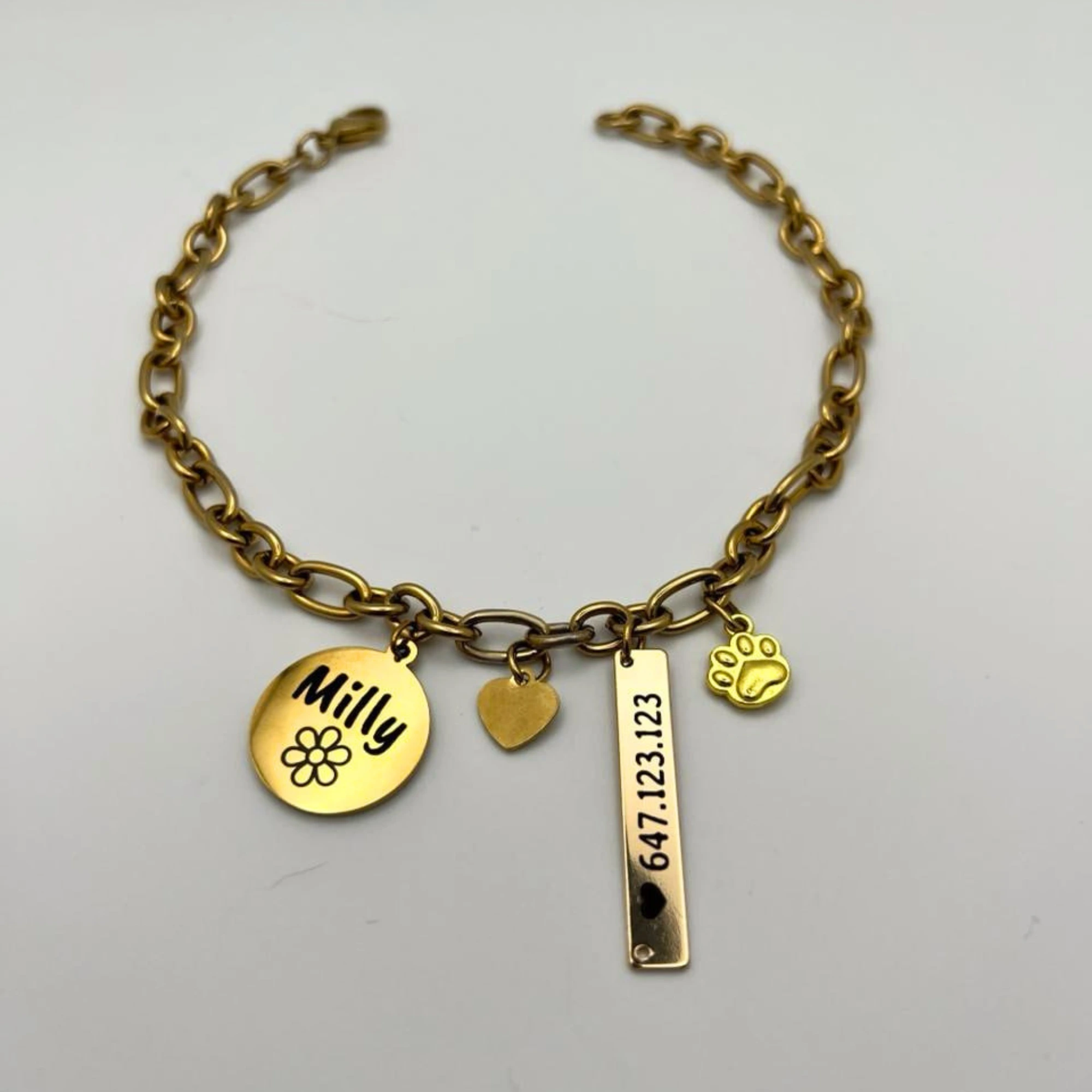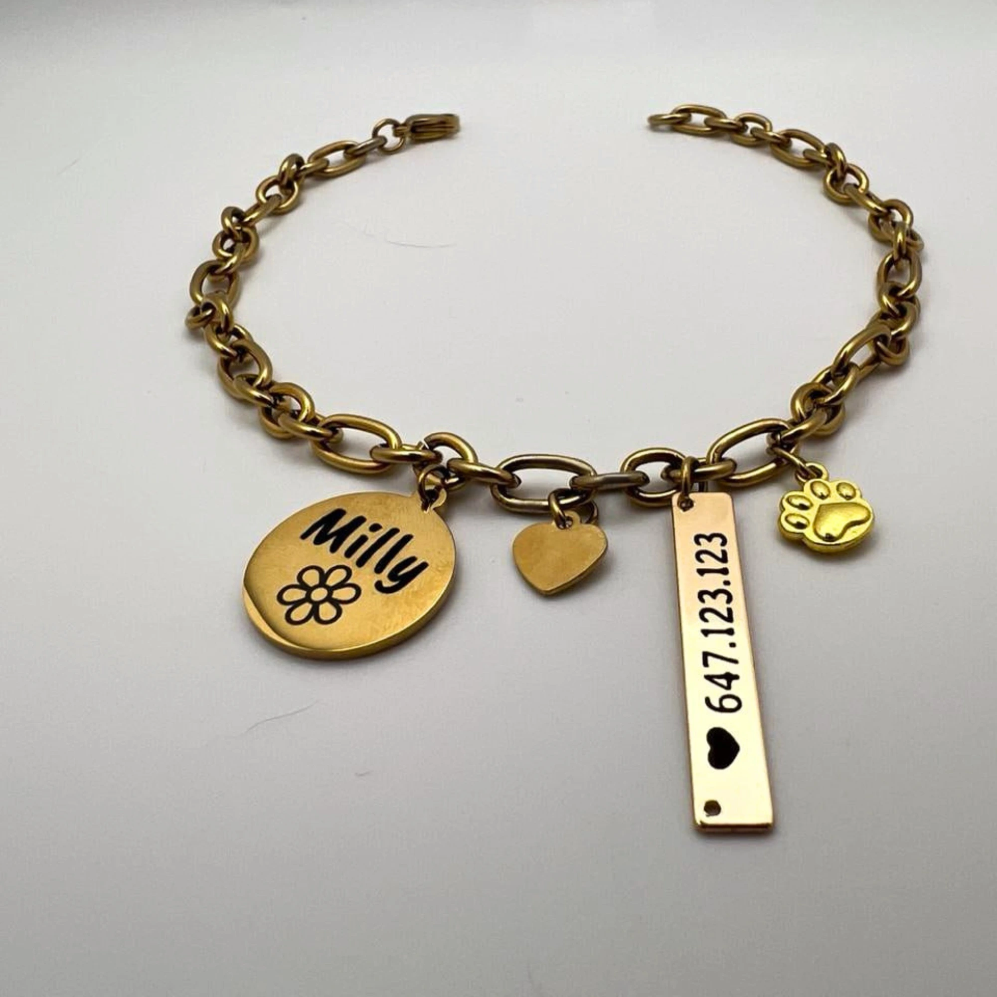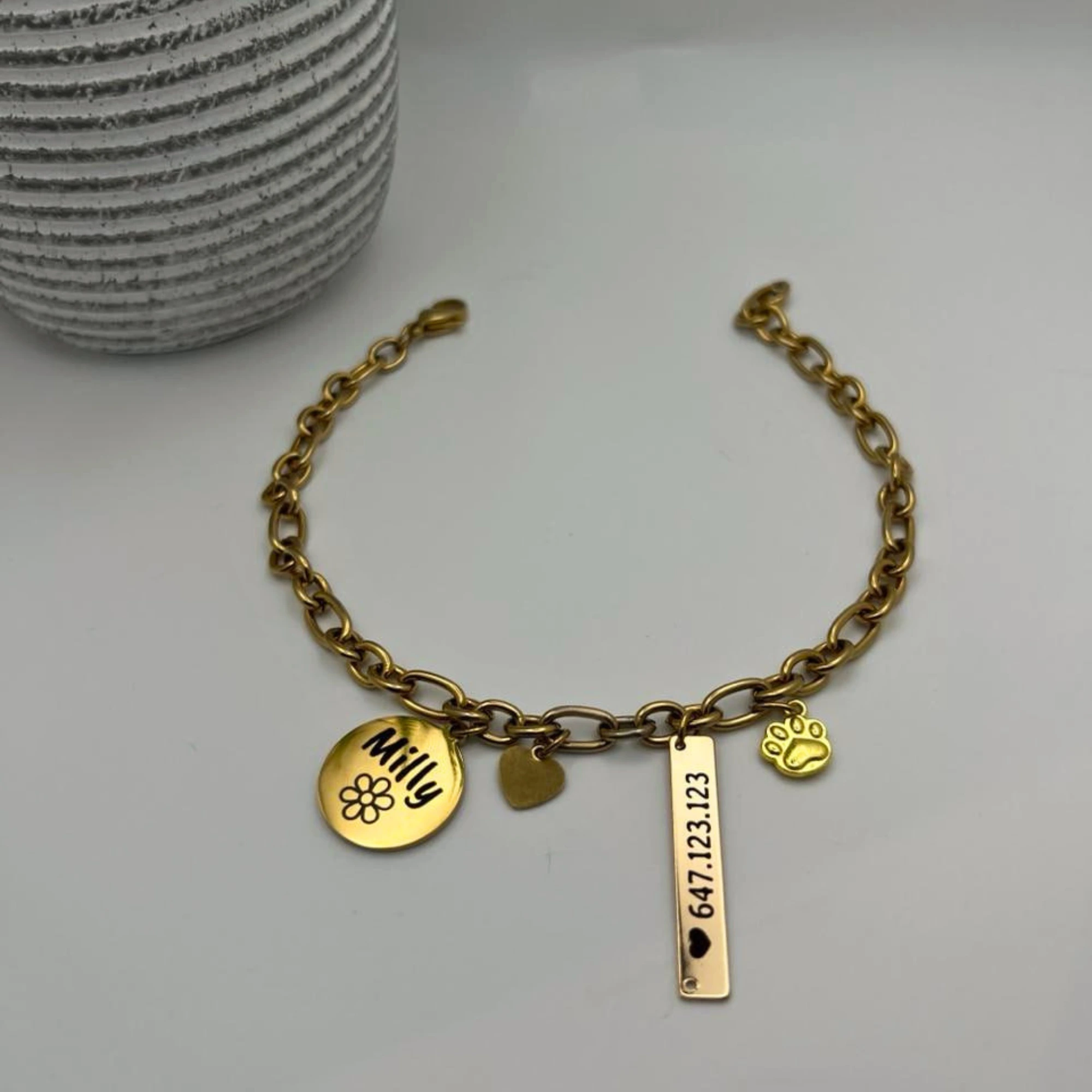 Featuring a main engraved name tag, delicate letter charms, and small decorative charms, each piece is carefully assembled by hand to create a collar upgrade that feels playful, meaningful, and beautifully personal.