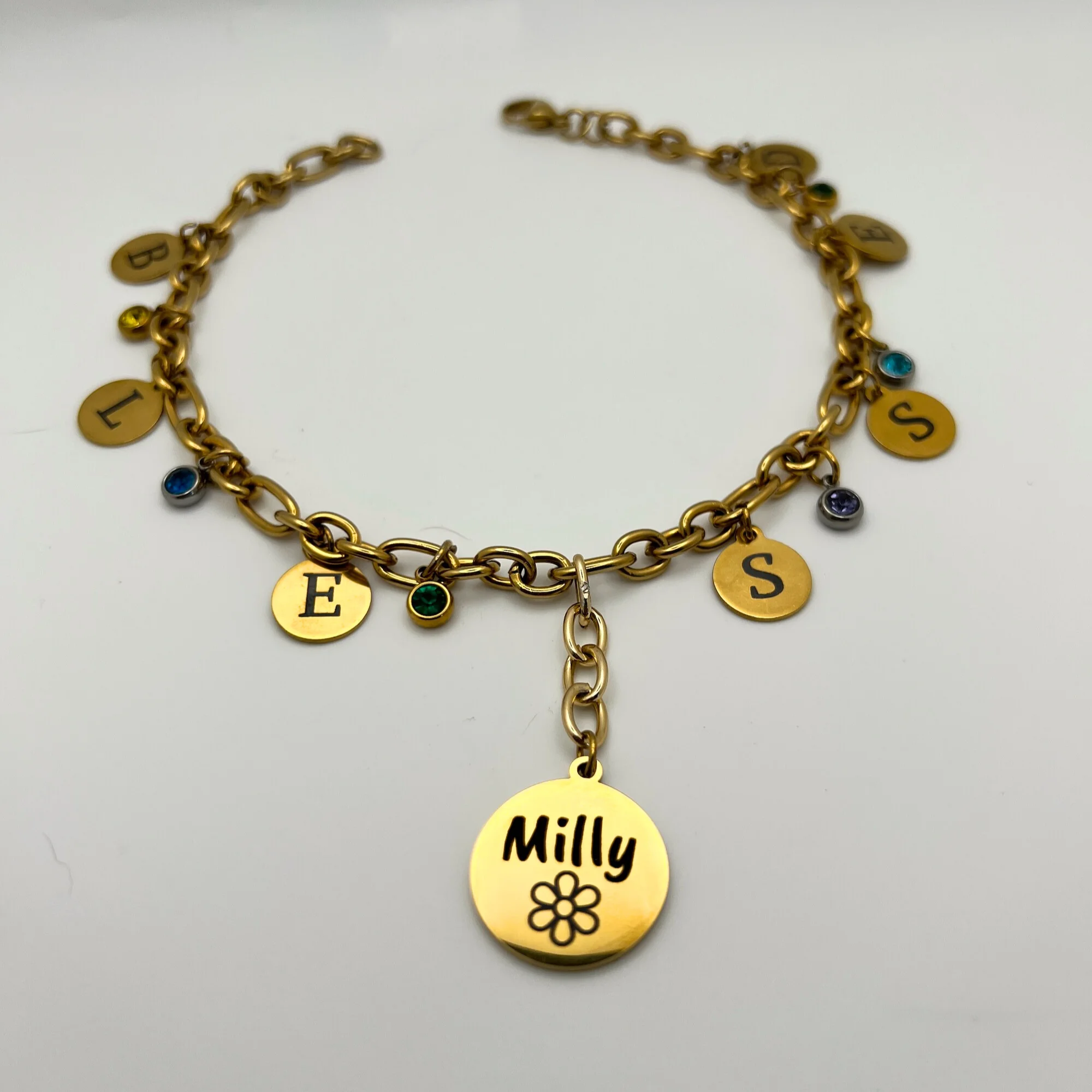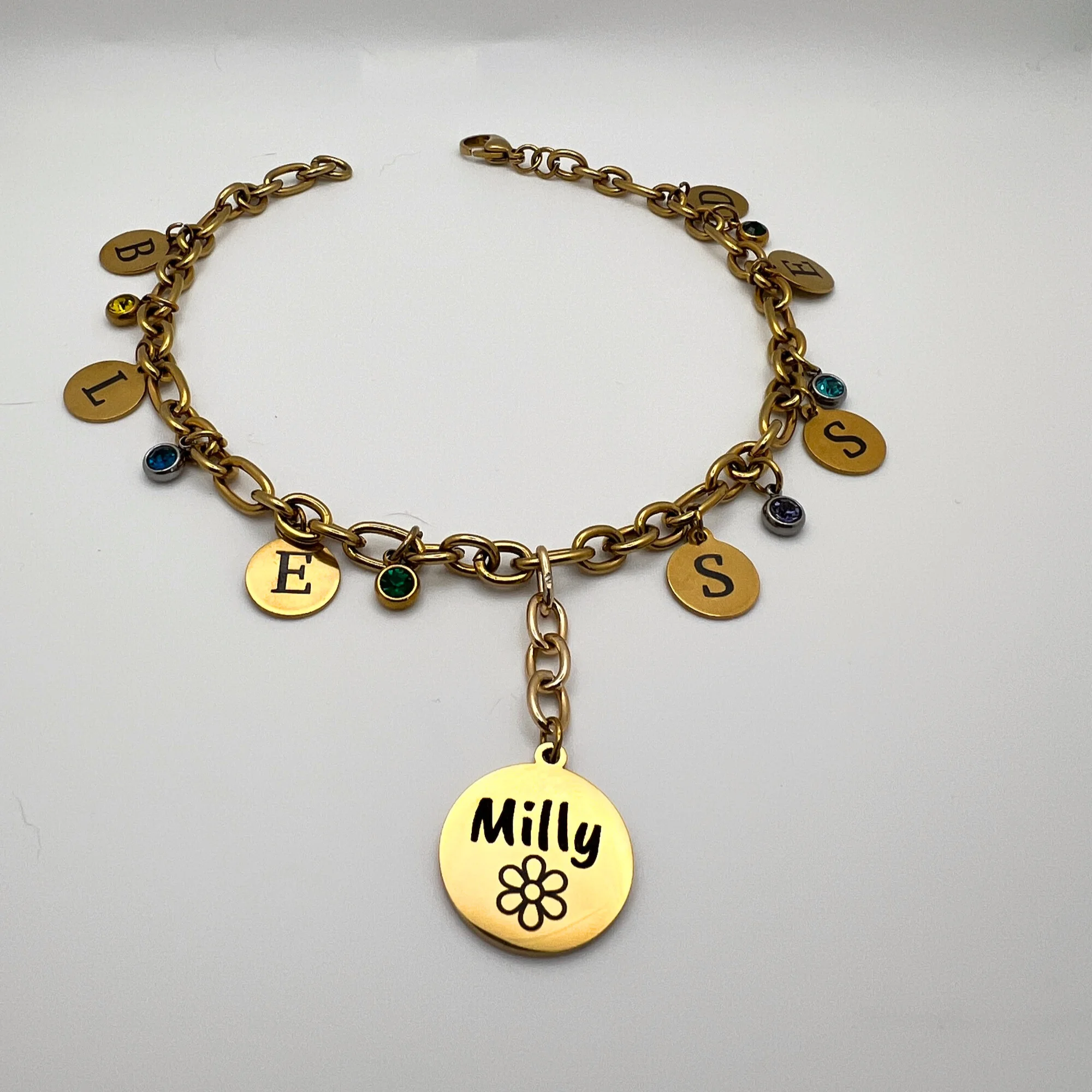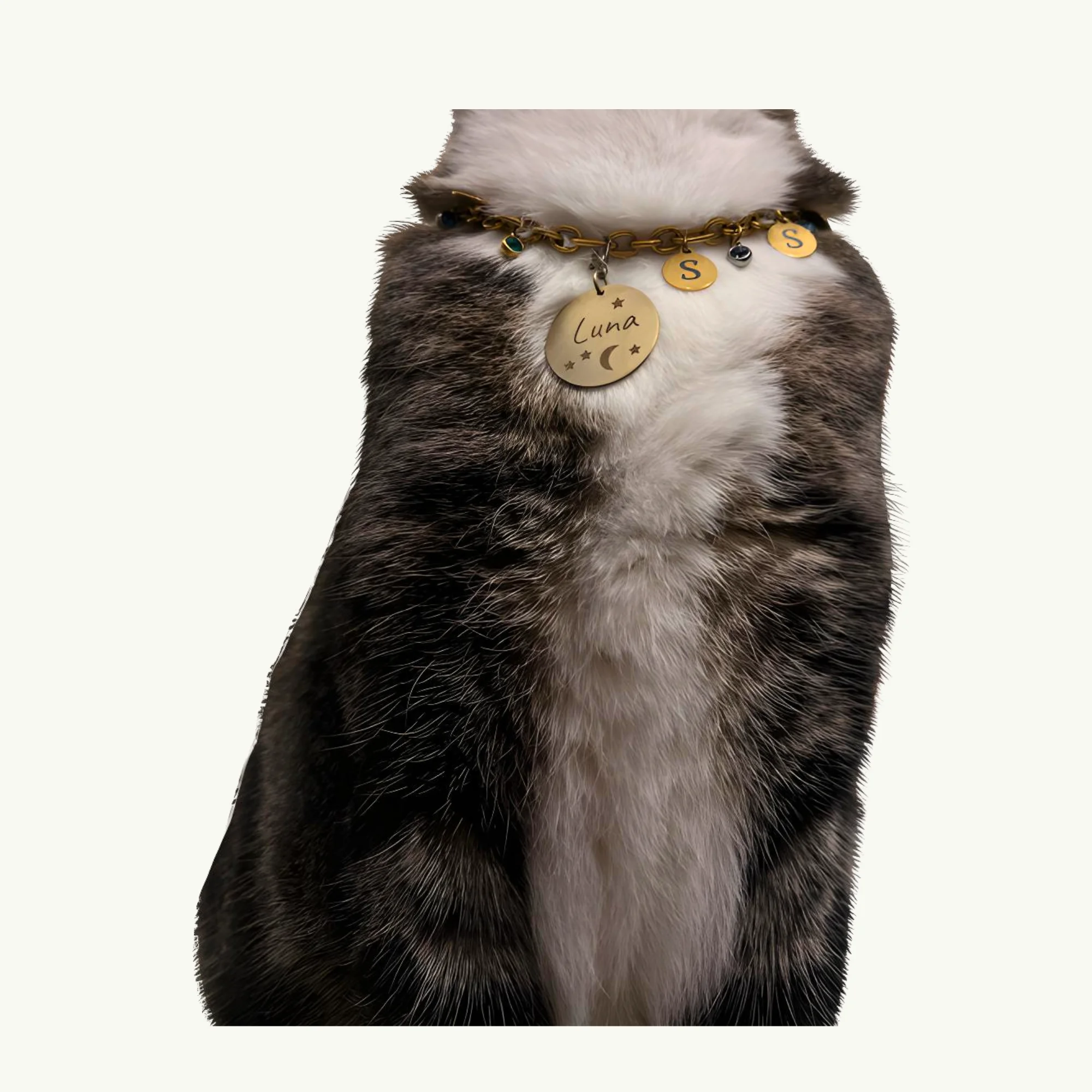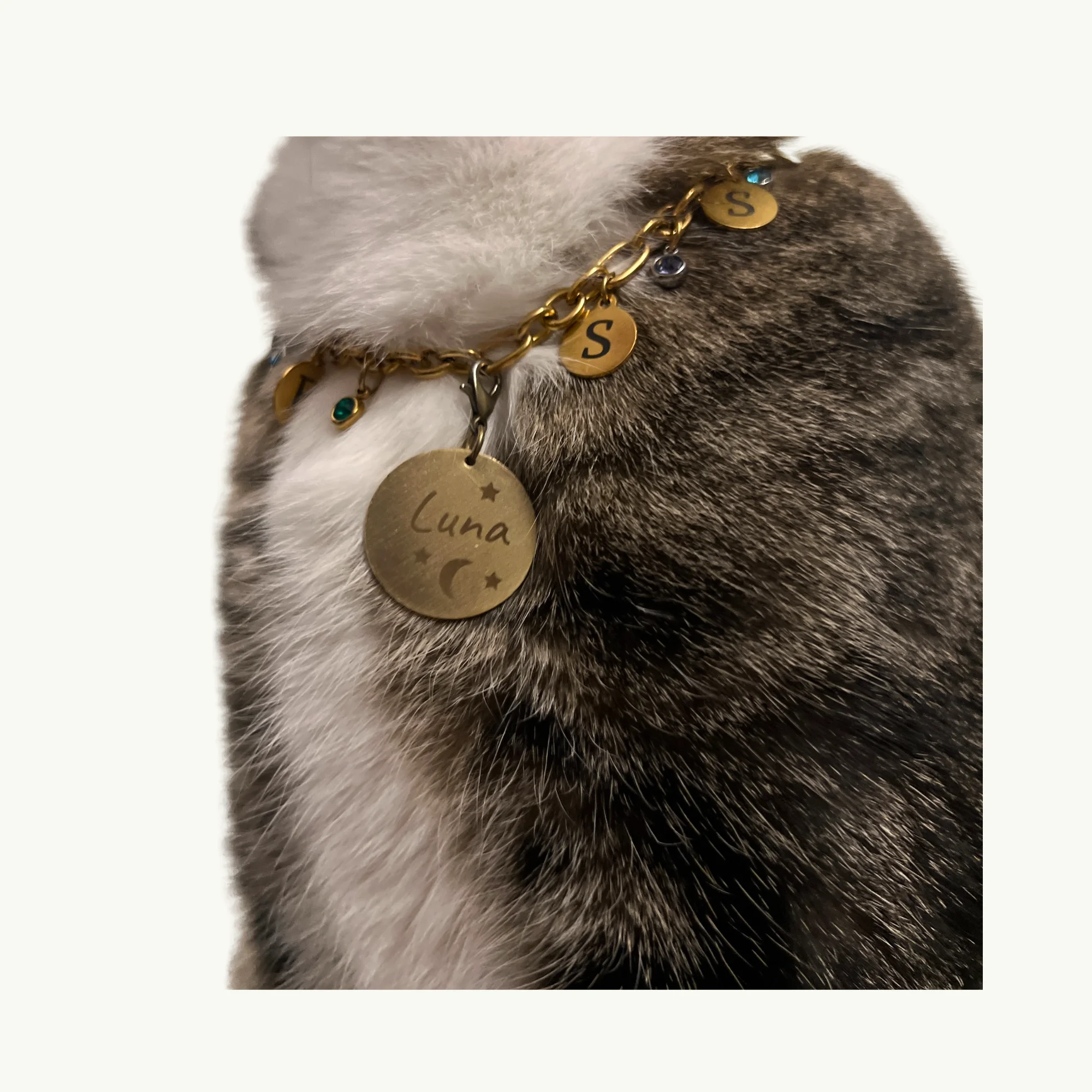 Featuring a main engraved name tag, delicate letter charms, and a birthstone crystal charm, each piece is carefully assembled by hand to create a collar upgrade that feels playful, meaningful, and beautifully personal.
