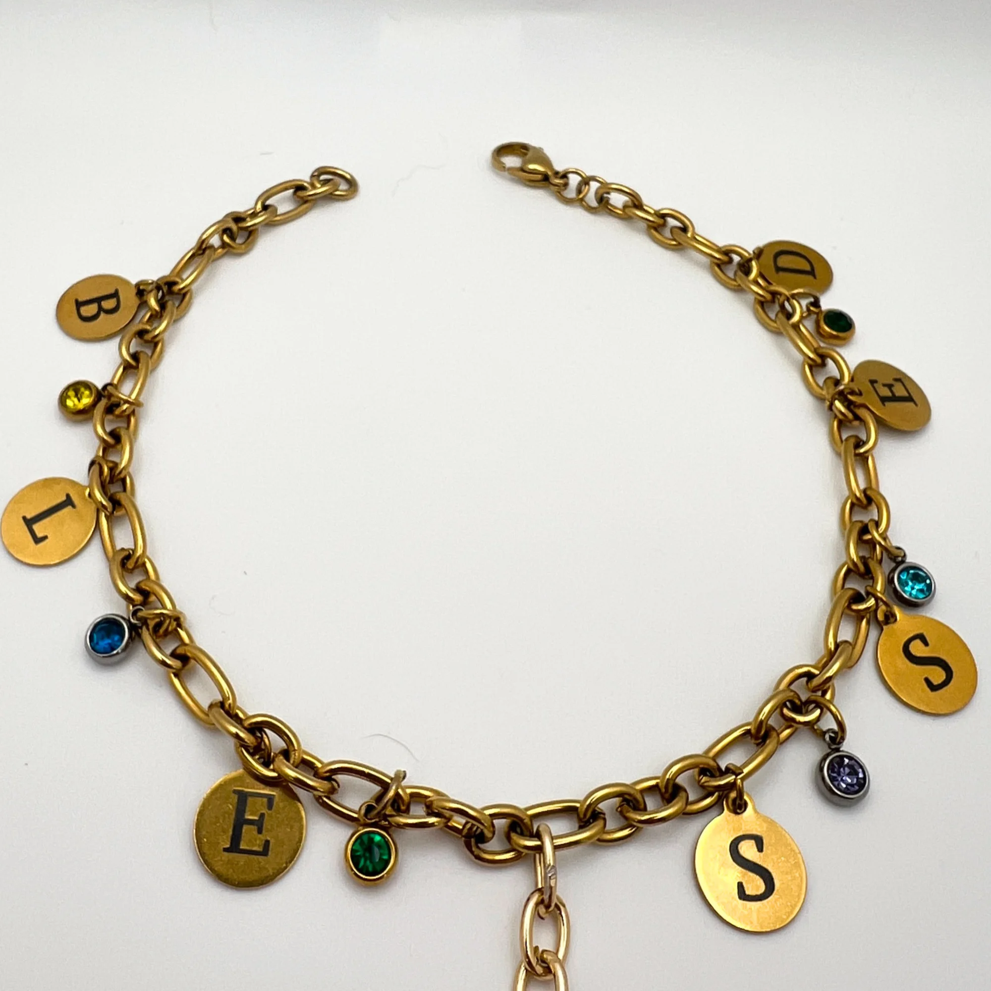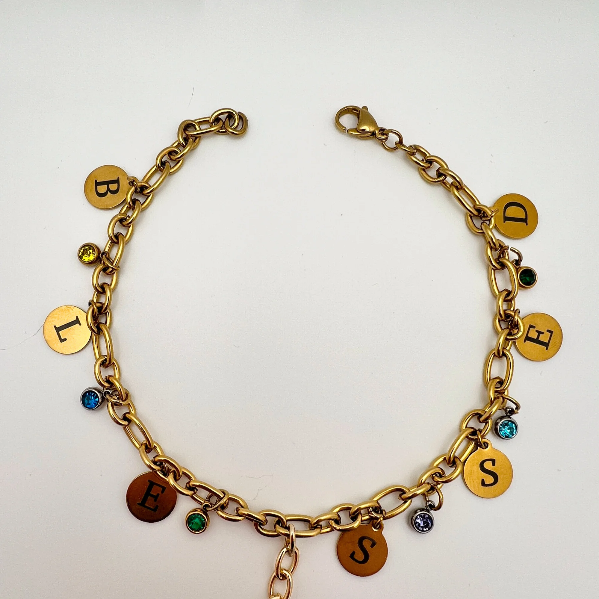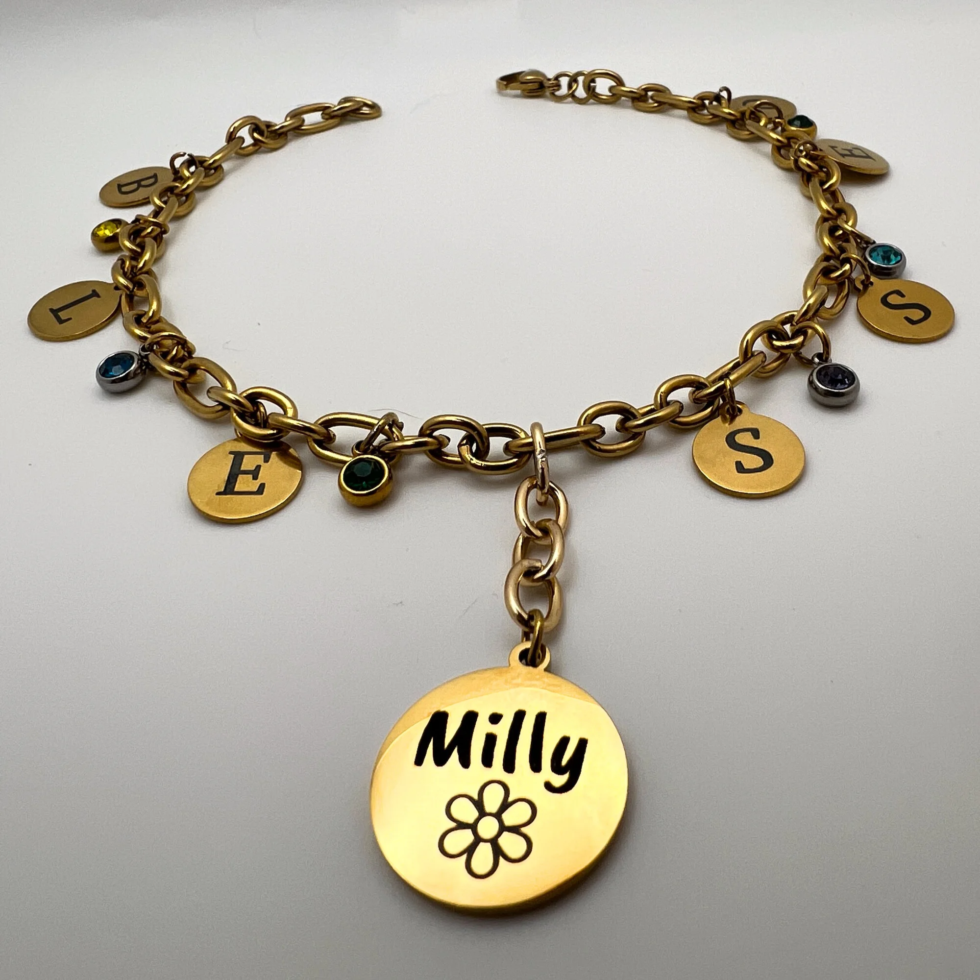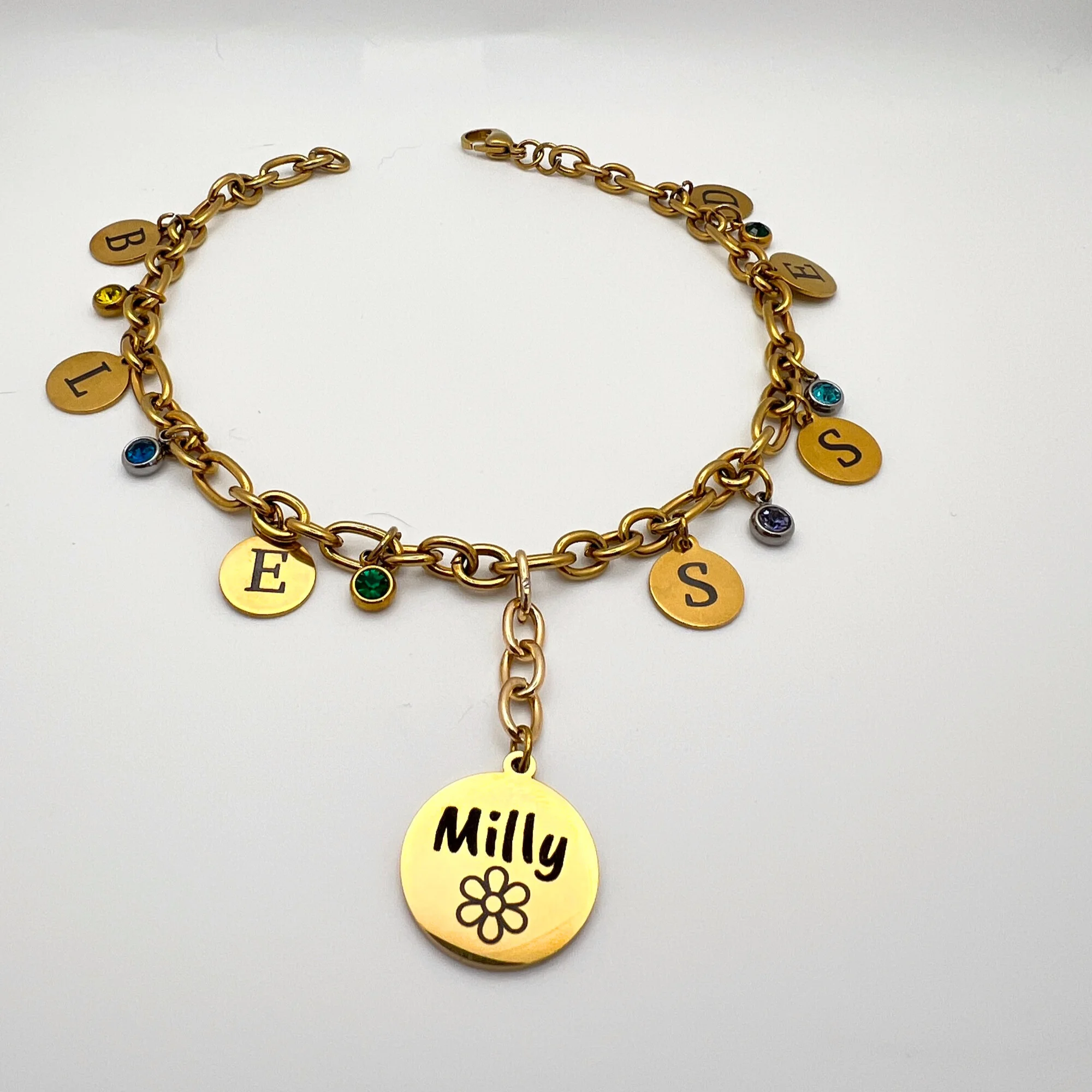 Featuring a main engraved name tag, delicate letter charms, and a birthstone crystal charm, each piece is carefully assembled by hand to create a collar upgrade that feels playful, meaningful, and beautifully personal.